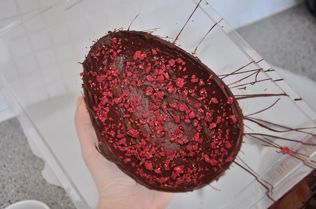 15. 將1茶匙已調溫朱古力放進擠花筒,沿著有乾燥紅桑子的蛋殼邊沿擠一圈,隨即黏上通花蛋殼,靜置5mins至凝固